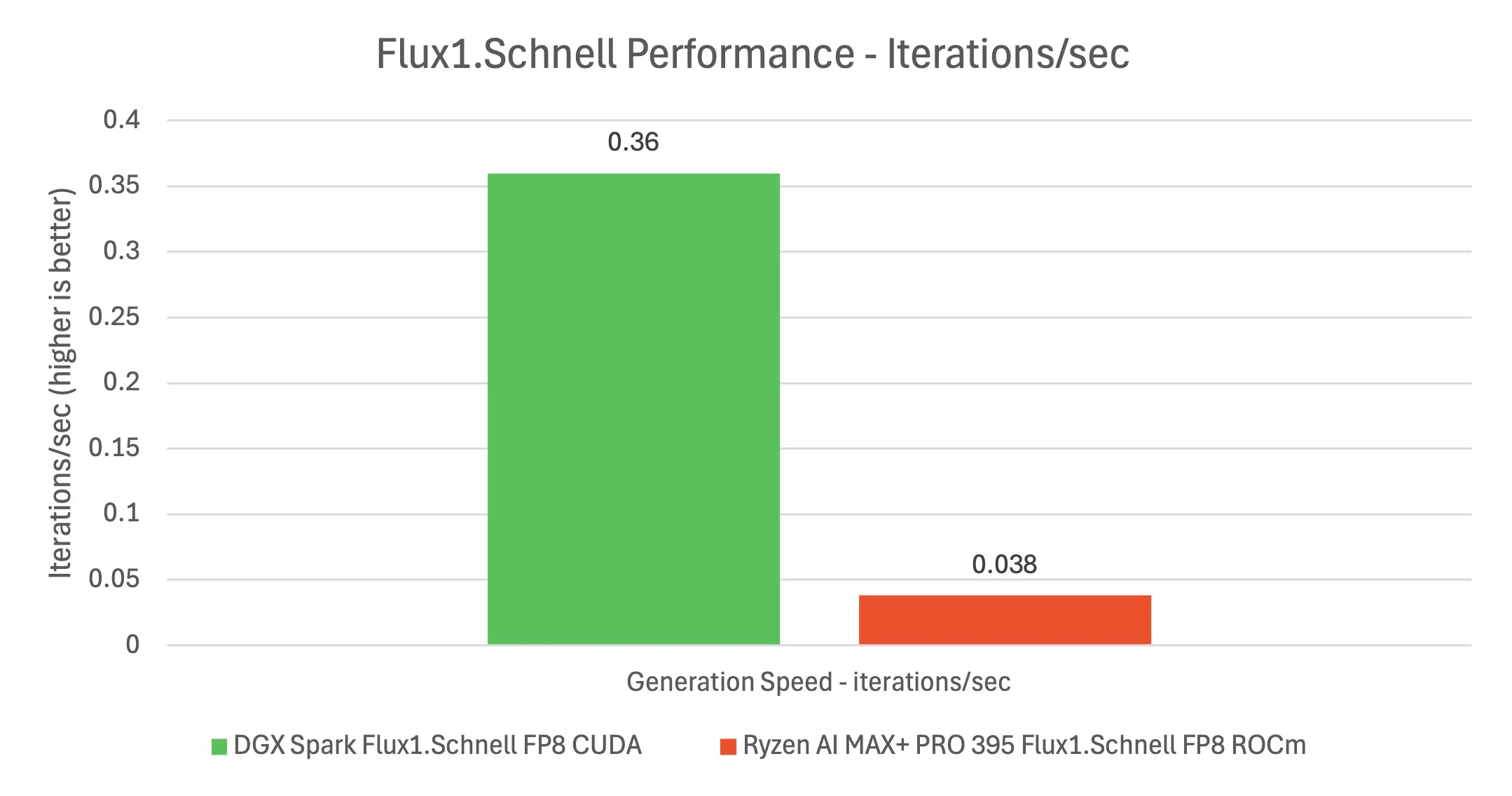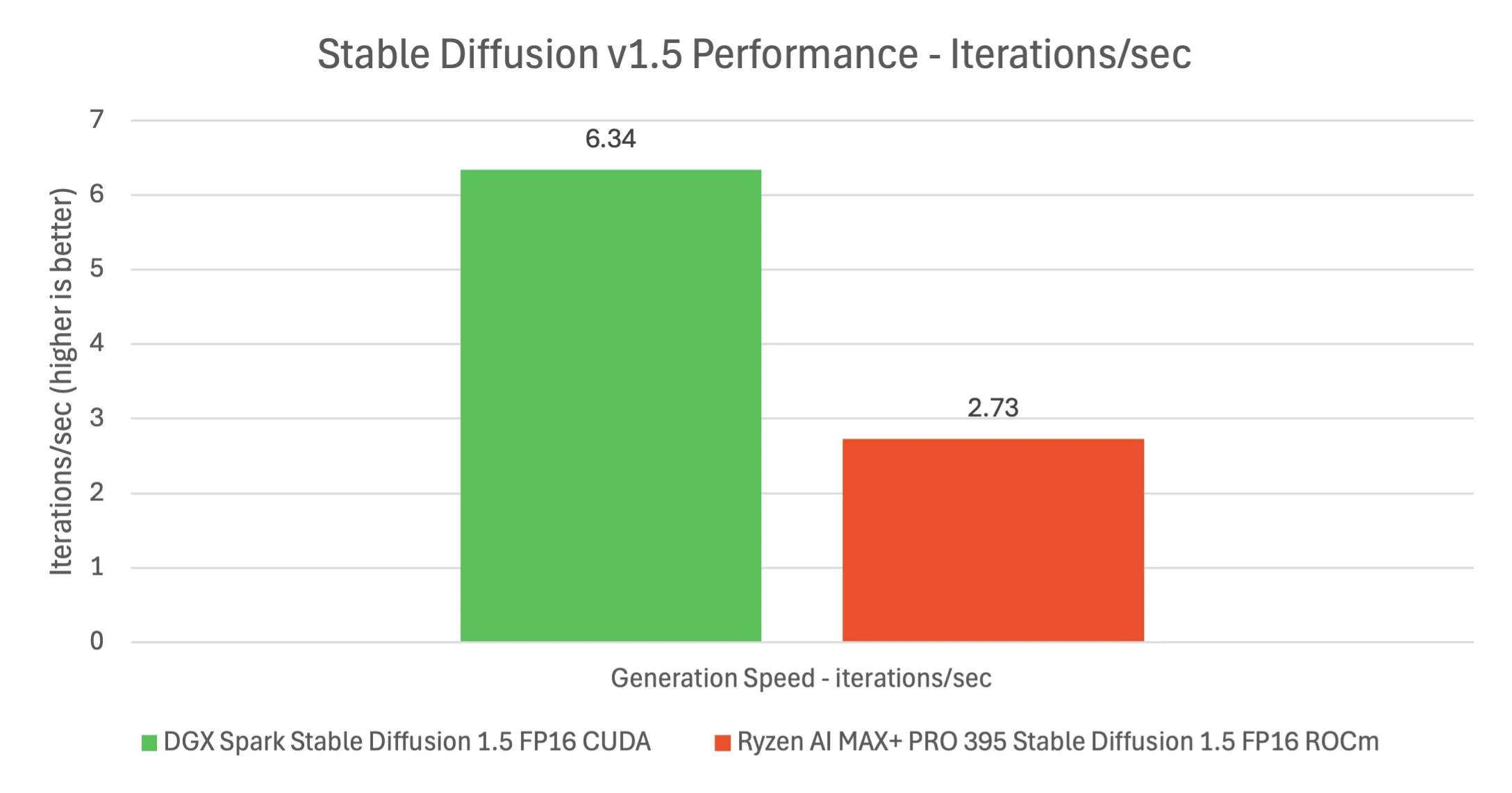 These playbooks were extremely useful for initial testing. Within a container on the Spark, ComfyUI spun up and we were generating images in minutes. The process was seamless, all the needed Docker containers and models were pulled automatically. In our tests, the DGX Spark churned out Stable Diffusion 1.5 images at about 19 images per minute (512×512 with default settings), which is roughly 6.3 iterations per second. For comparison, a recent AMD Strix Halo APU system (Ryzen AI Max 395 with integrated RDNA graphics) managed only ~8 images/min (2.7 it/s) on the same workload. So Spark was about 2.3x faster at stable diffusion inference than that high-end AMD chip, and in fact slightly faster than an NVIDIA RTX 4070 GPU we benchmarked earlier (which does ~5 it/s on SD1.5). The experience was practically plug-and-play, a testament to the well-built software environment. All drivers and libraries (CUDA, cuDNN, TensorRT) were correctly set up out of the box, and NVIDIA’s containerization of the workflow meant we had no dependency issues. It’s clear NVIDIA expects many Spark users to use containers and provided examples to avoid the “it works on my machine” syndrome.