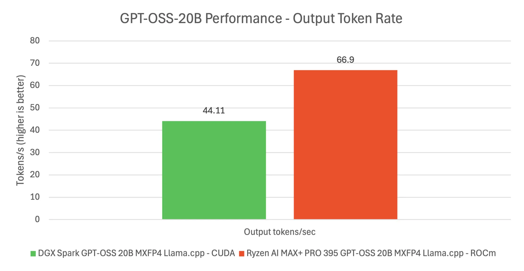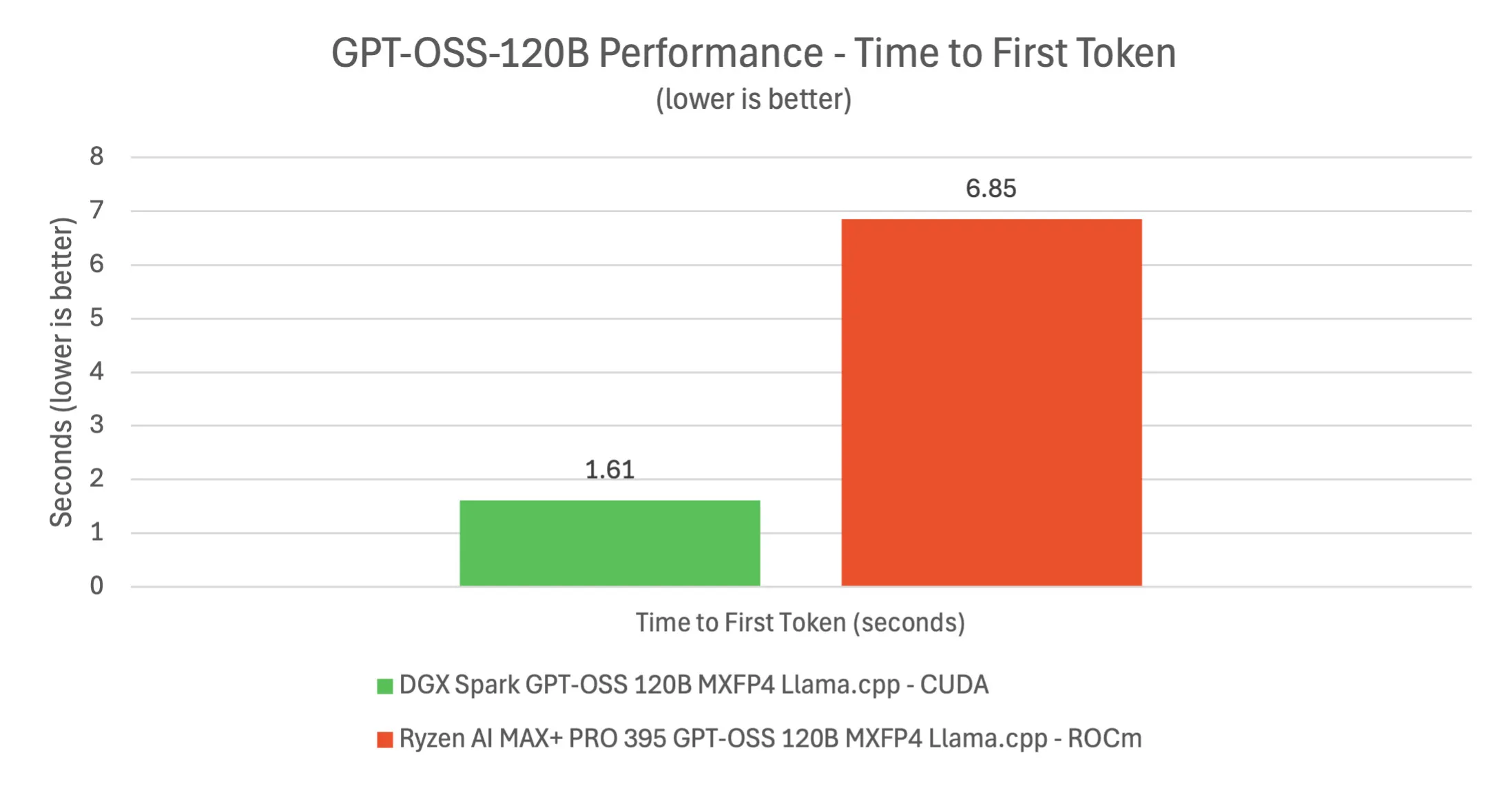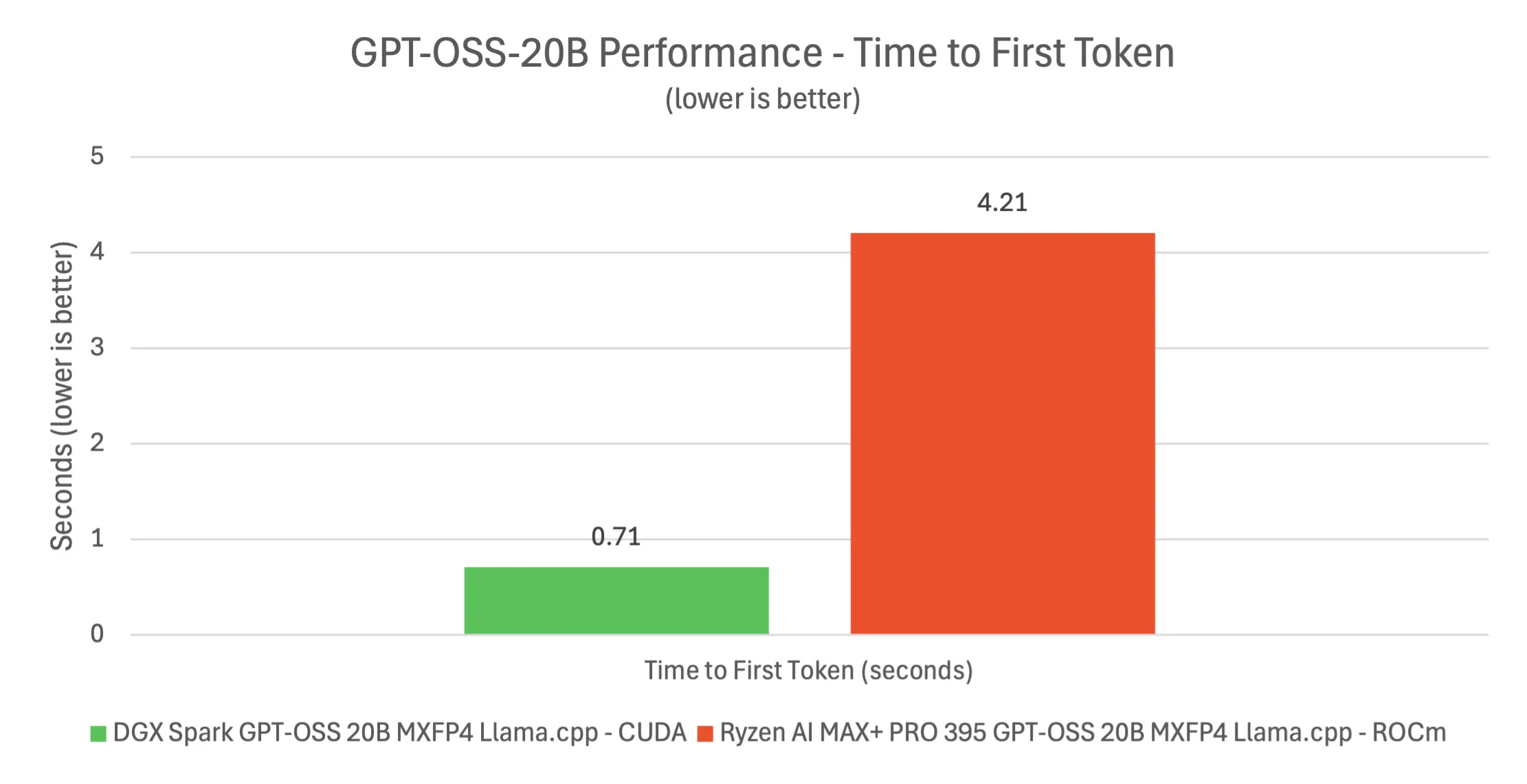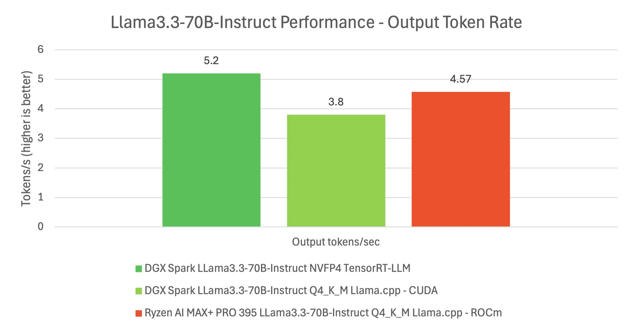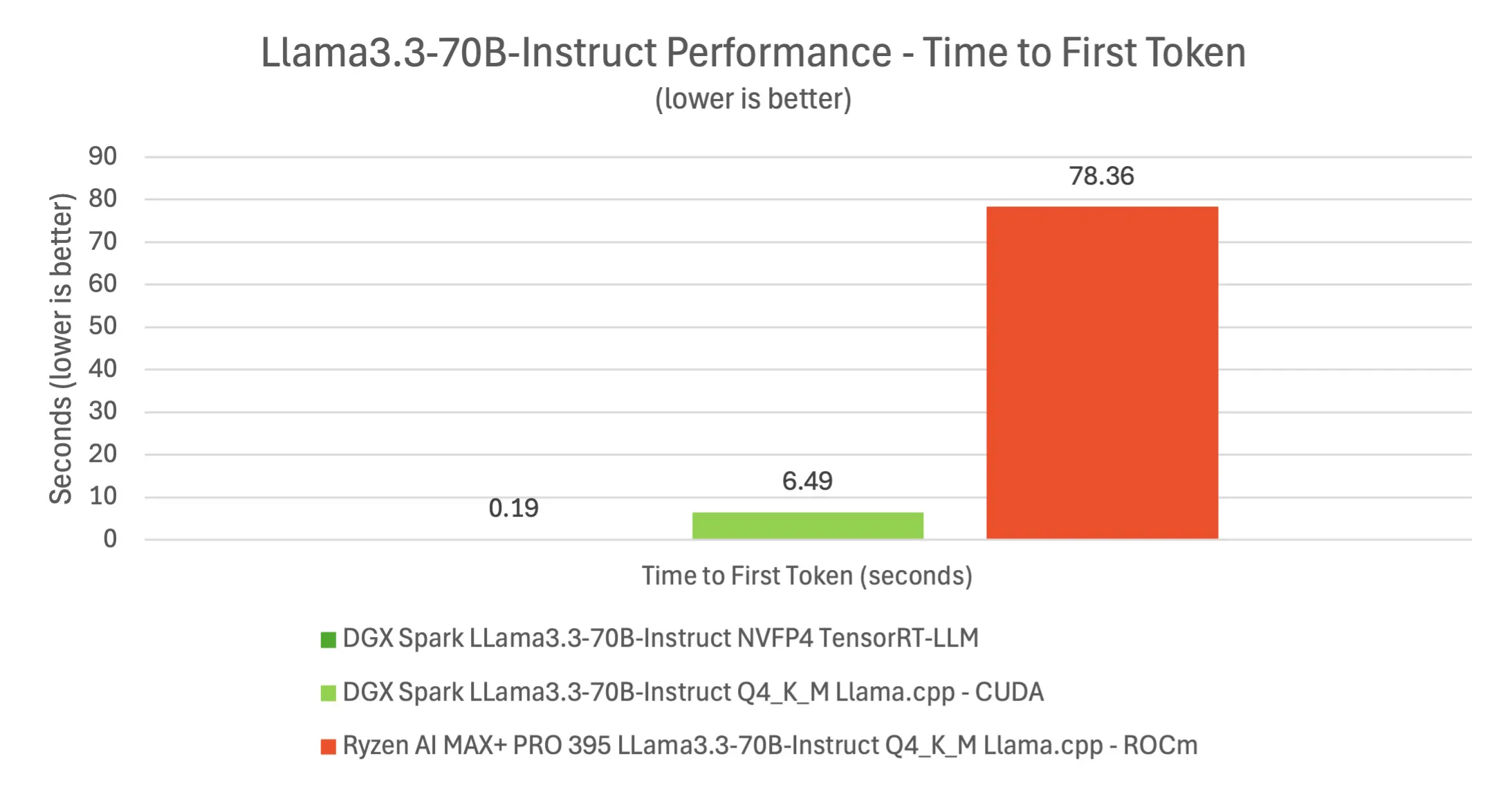 We also performed some more traditional benchmarks for good measure. Using the Llama 70B model (an instruct-tuned variant), we evaluated Spark’s performance in different modes. With NVIDIA’s FP4 TensorRT-LLM engine, the 70B model ran at ~5.2 tokens/sec generation, and astonishingly the first token arrived in under 0.2 seconds. In contrast, running the same 70B model in 4-bit integer mode via llama.cpp on Spark gave ~3.8 tokens/sec and about a 6.5 s first-token latency (reflecting the overhead of the CPU offloading during quantized decoding). Meanwhile, the AMD Strix Halo platform struggled with the 70B model: using 4-bit quantization on ROCm, it achieved ~4.6 tokens/sec but took a painful 78 seconds to emit the first token. This underscores how DGX Spark’s specialized hardware and software (FP4 support, TensorRT) make a tangible difference on larger models. In practical terms, working with a 70B or 120B model on Spark felt interactive (if not blazing fast), whereas on the AMD system it was borderline impractical due to the long initialization and slower throughput for the bigger models.