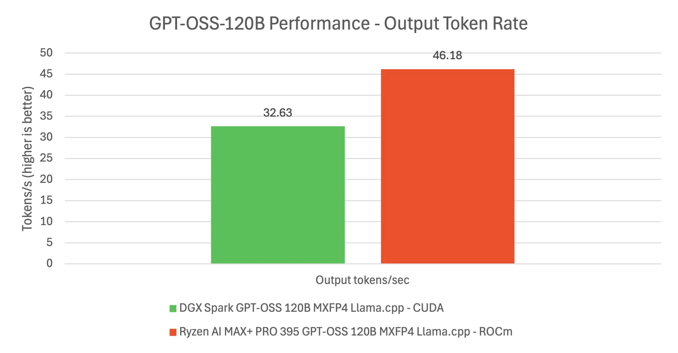 Next, we dove into what is arguably the Spark’s biggest use case: running large language models locally. One of the showcase demos was the GPT-OSS 120B parameter model. We deployed this on the DGX Spark, and it was genuinely impressive to see a 120B model running entirely on a single desktop machine, something essentially impossible until now. The 120B model (a GPT-J/OPT class open-source model) was loaded in 4-bit quantized form and served via NVIDIA’s optimized frameworks (a combination of TensorRT-LLM and llama.cpp backends). Thanks to the 128GB unified memory, the model fit with room to spare. The time-to-first-token for the 120B model was about 1.6 seconds in our tests using a CUDA-accelerated pipeline, whereas an AMD Strix Halo system took over 6–7 seconds for the same (using ROCm on its iGPU). Once generation started, Spark produced text at roughly 32–33 tokens per second for the 120B model. Interestingly, the AMD system sometimes hit slightly higher steady token/sec (~46/sec), but that is with a significant delta and disadvantage in latency and TTFT.