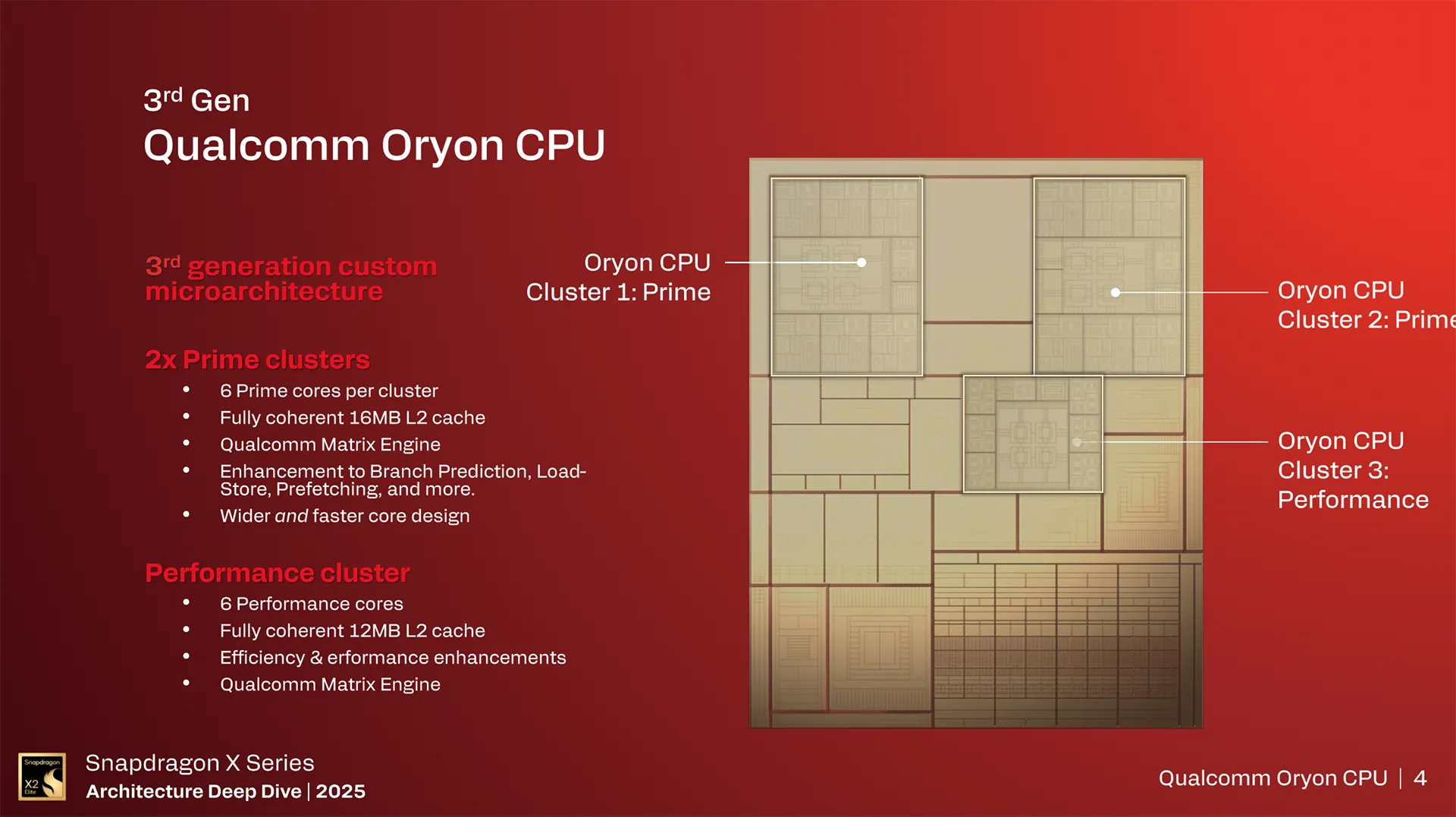 The CPU aspect of the Snapdragon X2 Elite sees some major changes compared to Snapdragon X1 Elite (which may or may not be what it is officially called going forward). The CPU has advanced and is now based on the 3rd generation Oryon core microarchitecture. Snapdragon X1 Elite was based on 1st generation Oryon, and the debut of 2nd generation Oryon was last year with the Snapdragon 8 Elite mobile products.